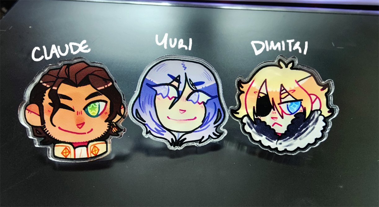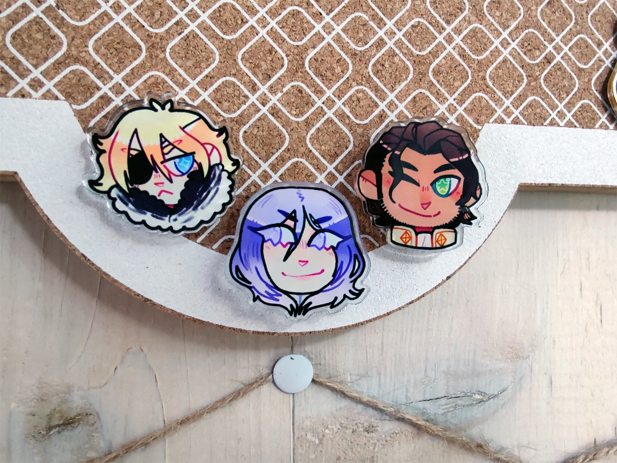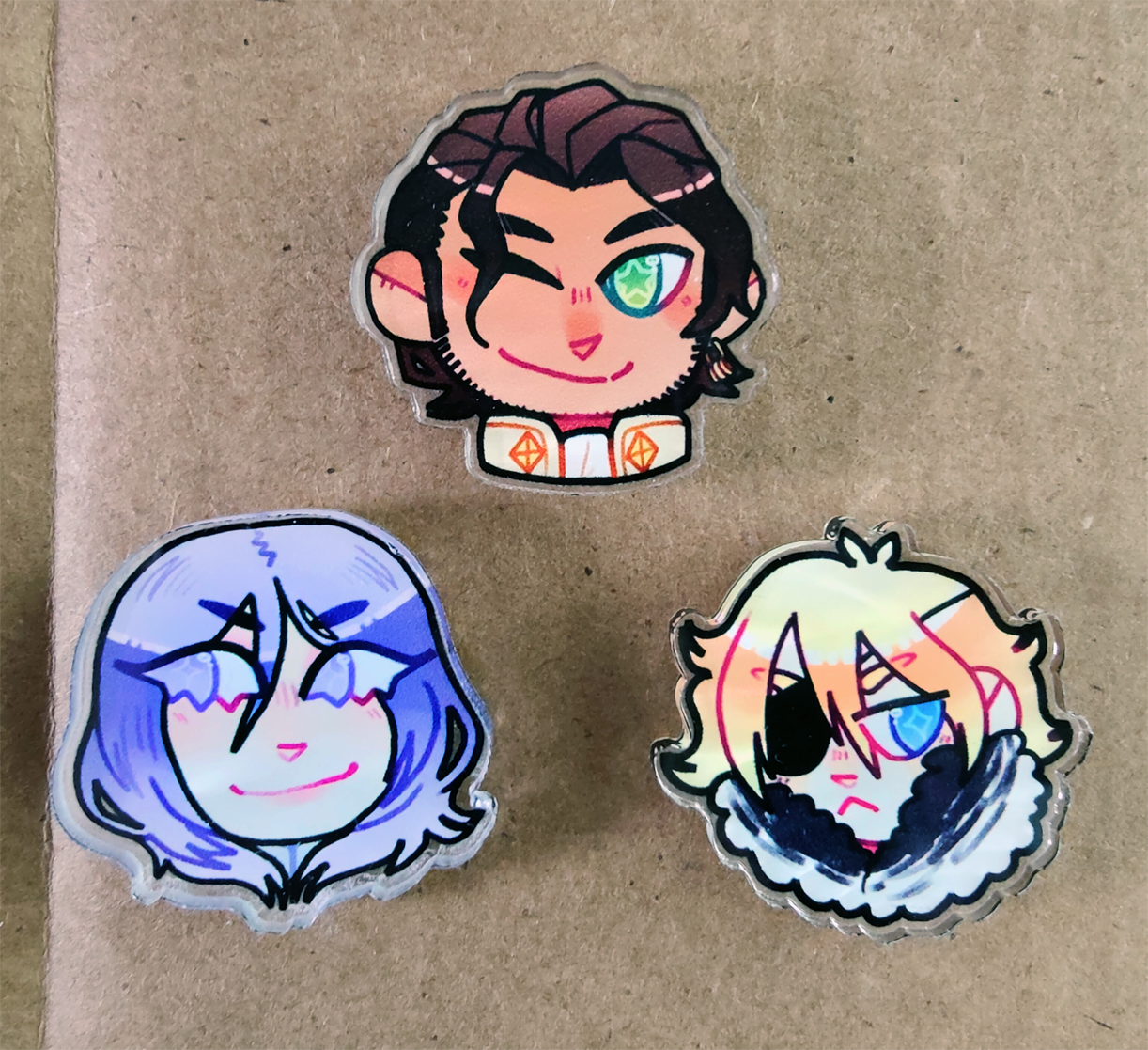 Each of these pins is printed on clear acrylic, with one pinback. They're roughly 1"x1". Their colours are vivid and they're fairly durable! Perfect for pinboards, lanyards, or itabags.